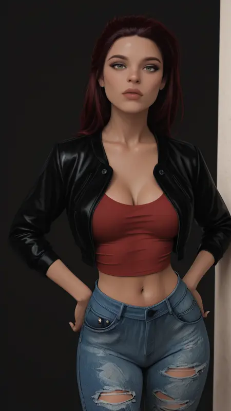 빨간 탱크 탑, 낮은 네크라인, 가슴 노출, 검정 재킷, 크롭 재킷, 긴 소매, 복부 노출, 슬림 진, 찢어진 슬림 진, 헐어진 구멍