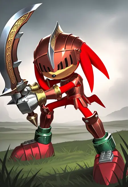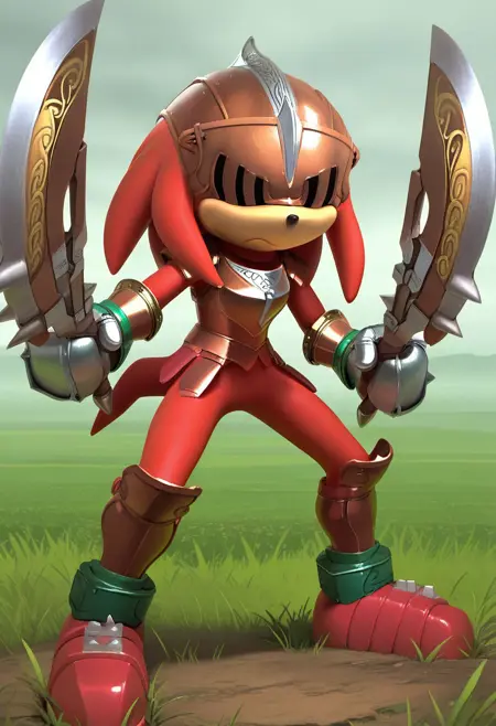 Sir Gawain, furry, echidna, red fur, dark brown helmet with gray spike in middle, dark brown visor, dark brown armor, fully armored, holding brown daggers, silver gloves, red shoes