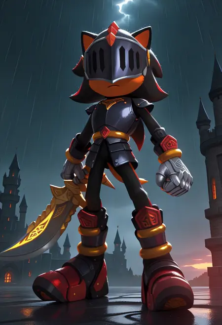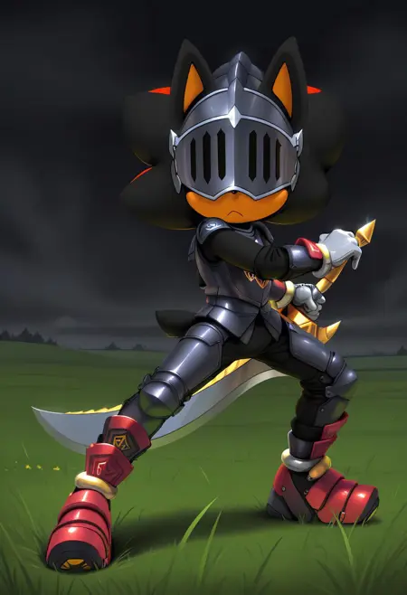 Sir Lancelot, furry, black fur, red streaks in fur, dark gray visor, dark gray armor, armored vest, holding sword, yellow and dark gray sword, silver gloves, dark gray and red boots