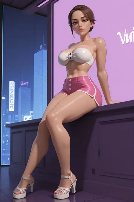 Short hair, brown eyes, brown hair, single hair bun, black eyelashes, black thicks eyebrows