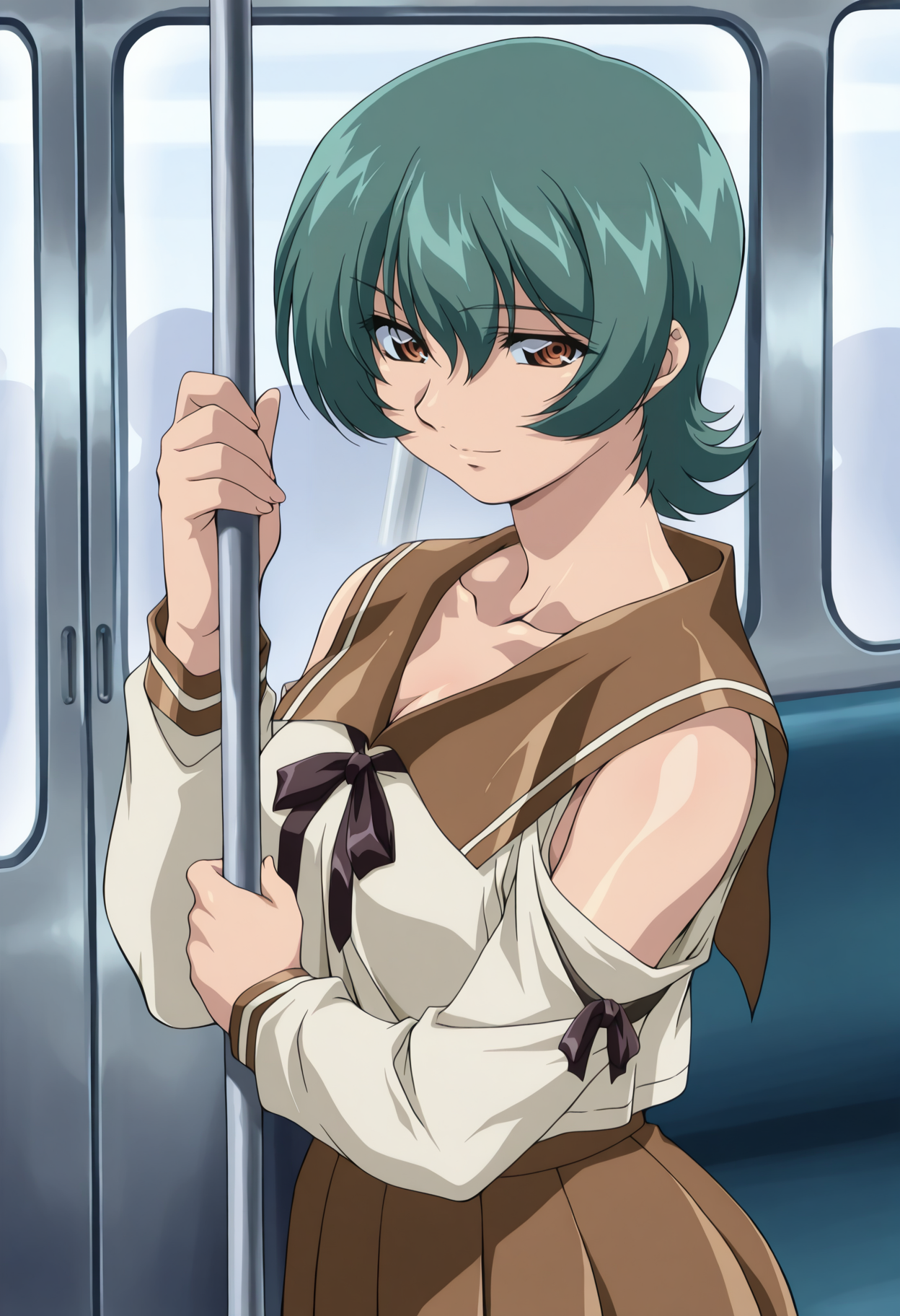 セーラー服:aki_i、1girl、アニメ風色付け、レトロアートスタイル、シングル、ショートヘア、緑の髪、目の間の髪、茶色い目、akiセーラー服、茶色いセーラー襟、外れ袖、ロングスリーブ、黒いリボン、茶色のスカート、胸元、お腹、へそ