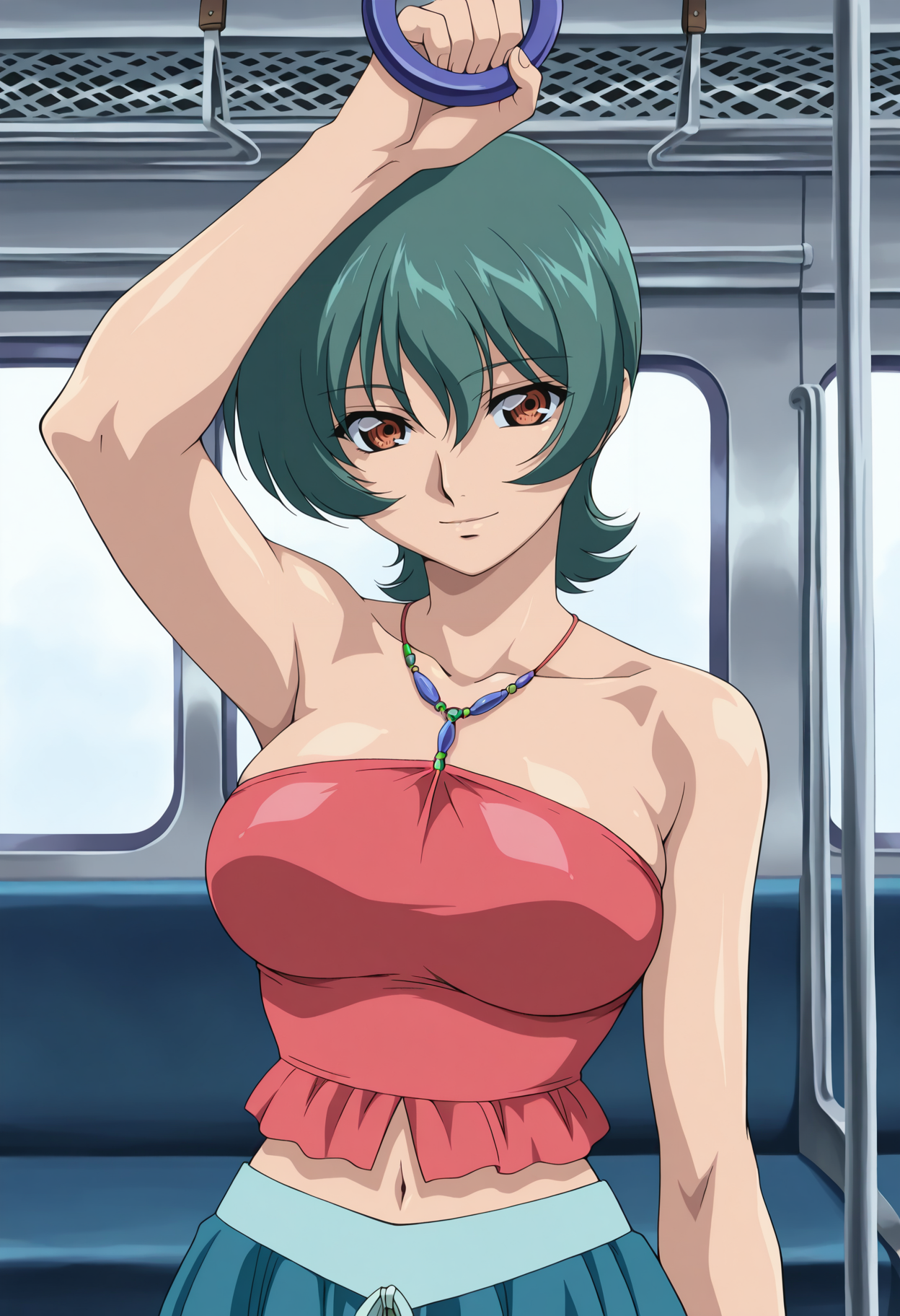 ベース:aki_i、1girl、アニメ風色付け、レトロアートスタイル、シングル、ショートヘア、緑の髪、目の間の髪、茶色い目、akiレッドクロップトップ、akiジュエリーネックレス、裸の肩、お腹、へそ、akiブルーミニスカート、鎖骨、大きな胸