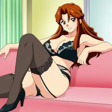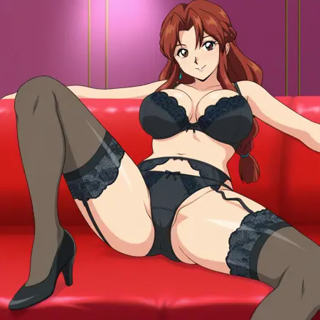Black lingerie Outfit 1: (Kanzuki Akara, Boku no Adult Venus, boku-no-av, boku-no-av-Kanzuki_Akara, milf, brown eyes, brown hair, long hair, wavy hair, large breasts, lingerie, underwear, black lingerie, bra, black bra, panties, black panties, thong, garter belt, thighhighs)