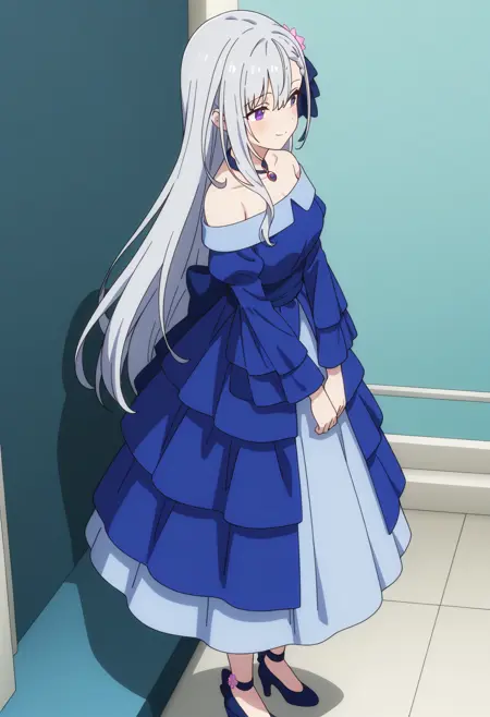 white hair flower, purple hair ribbon, hair ornament, pearl necklace, jewelry, bare shoulders, blue dress, strapless, cleavage, long dress, plated skirt, ankle strap, blue high heels