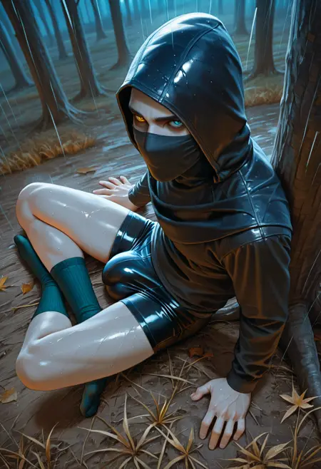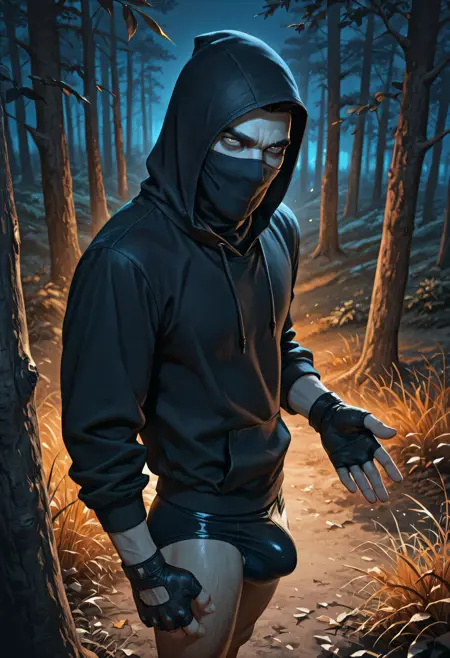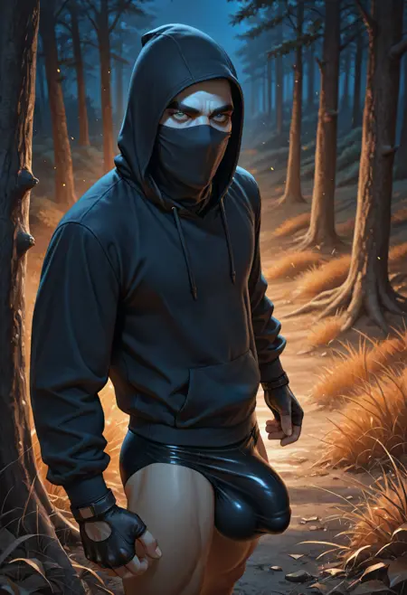Trigger words for armor: cloth face mask, hooded rogue, dark leather hood, hood up, gloves, layered leather armor, tall strapped boots,