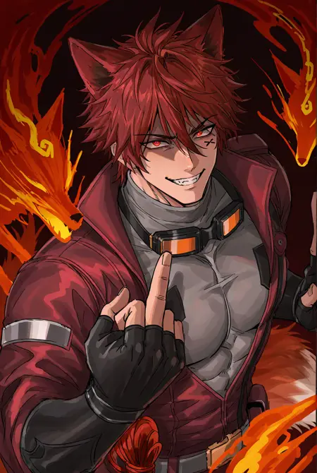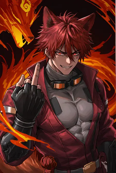ch1ave, 動物の耳, 赤髪, 目の間の髪, 短髪, 尾, 赤い目, 顔の模様, 狐の耳, 首にかけたゴーグル, ゴーグル, 手袋, 黒手袋, 指なし手袋, ジャケット, 赤いジャケット, 灰色のシャツ, パンツ