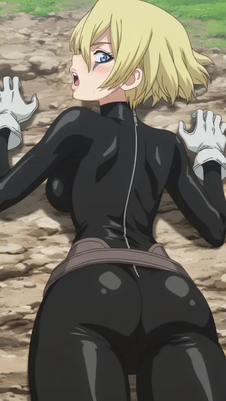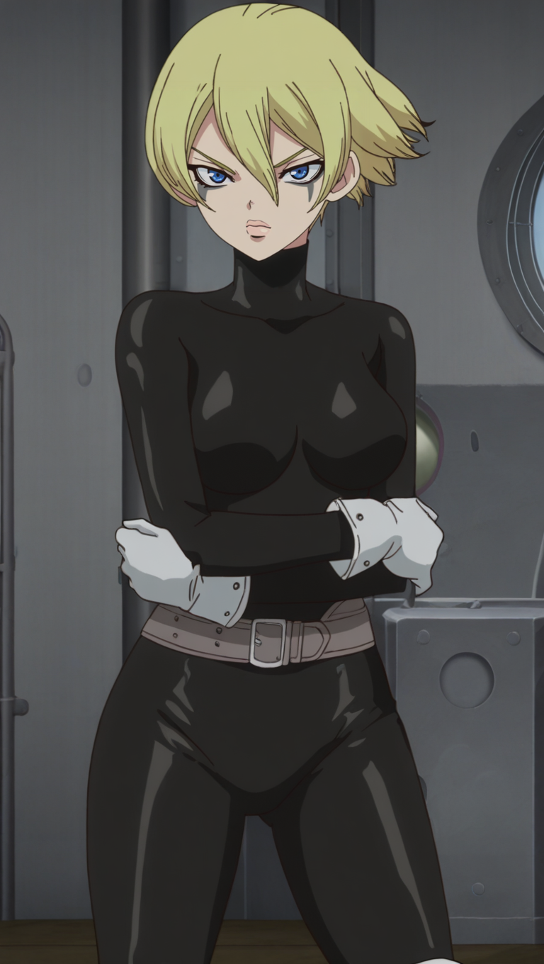 军装,黑色紧身衣,银色手套,银色靴子,棕色腰带,面部标记,乳房,中等大小乳房,紧贴皮肤,