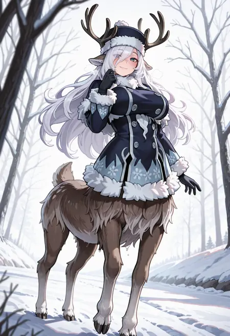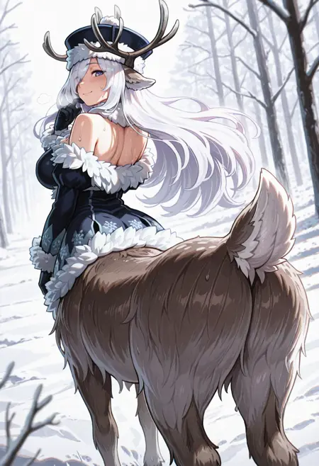 whitehornmge, reindeer girl, monster girl, centauroid, taur, hooves, reindeer antlers, deer ears, deer tail, chest tuft