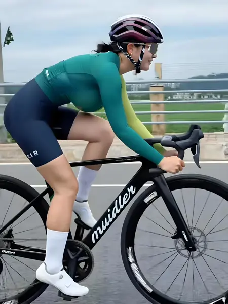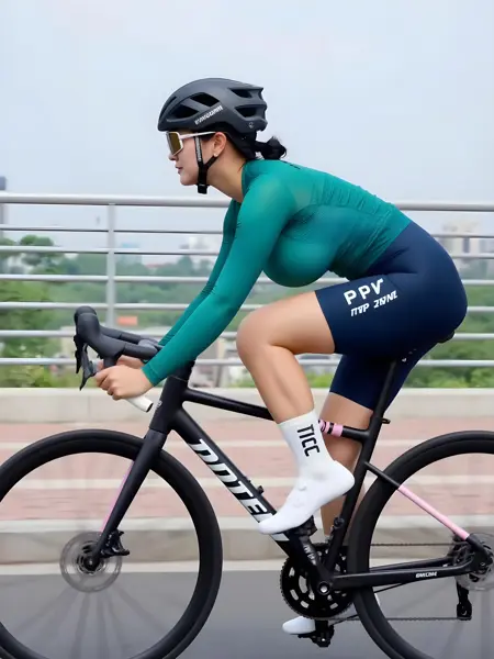 向南,人物身着紧身骑行服,胸脯圆润,绿色上衣与深蓝短裤勾勒出健美的曲线。她骑着一辆黑色公路自行车,姿态前倾,展现出优秀的体能和专注力。头戴黑色头盔,佩戴护目镜,安全装备齐全。白色袜子与骑行鞋相配,整体装扮专业且时尚。背景为户外场景,金属护栏与绿植点缀其间,远处建筑隐约可见。人物腿部线条流畅,肌肉紧实,手臂有力地握住车把,尽显运动之美。