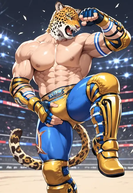 tekken,キング, ジャガーの頭, ブーツ, ジャガーの尾, グラップリング衣装, 肘当て, 青いズボン, ゴールドのトランクス,