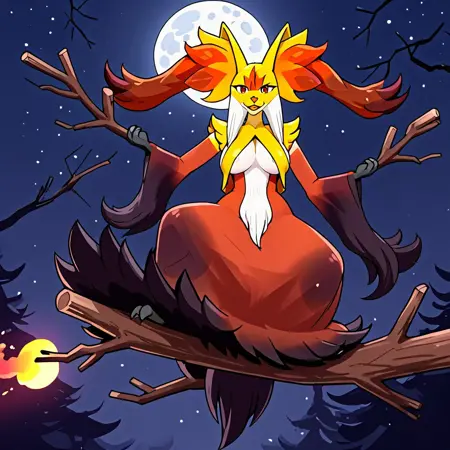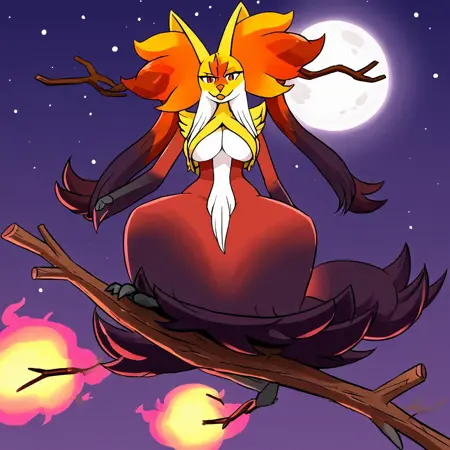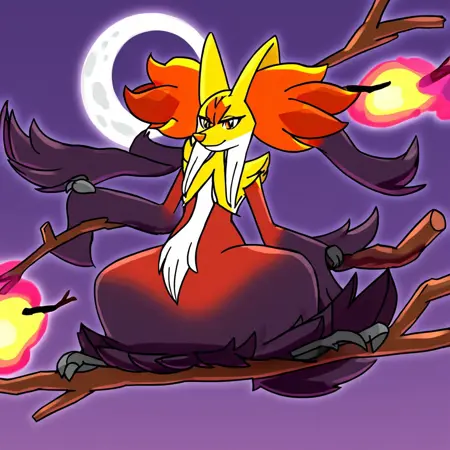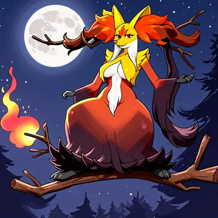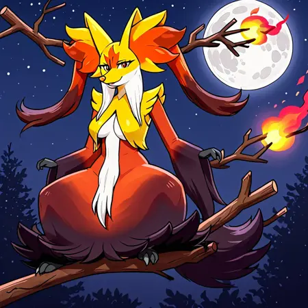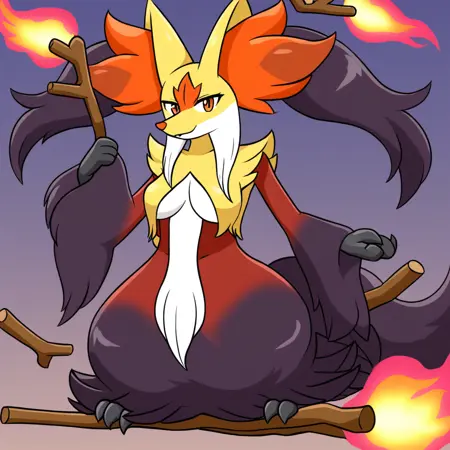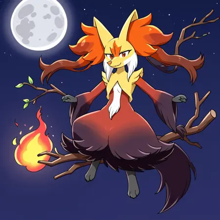 "mega delphox" "pokemon", "creature", "fantasy" "character lora" "fox" "anthropomorphic" "fire" "psychic" "orange fur", "red fur" "large ears", "tufts of fur" "long fur coat" "fluffy tail" "staff" "mega evolution" "mega form" "anime style", "digital painting", "official style", "fanart" "glowing eyes", "fire magic", "psychic aura", "battle stance"