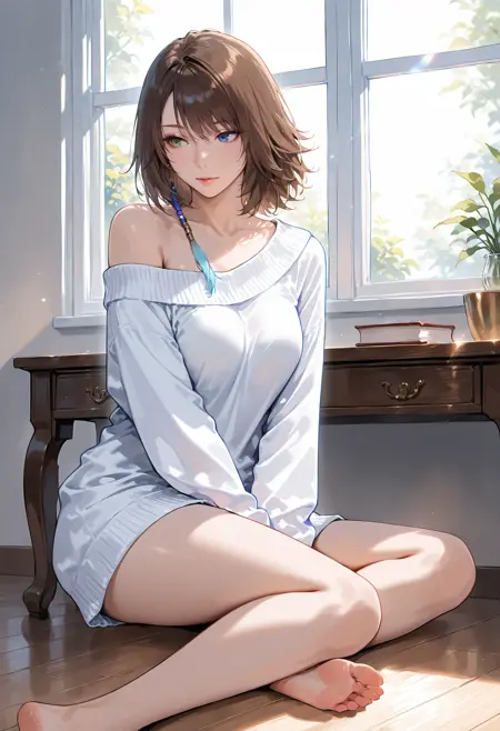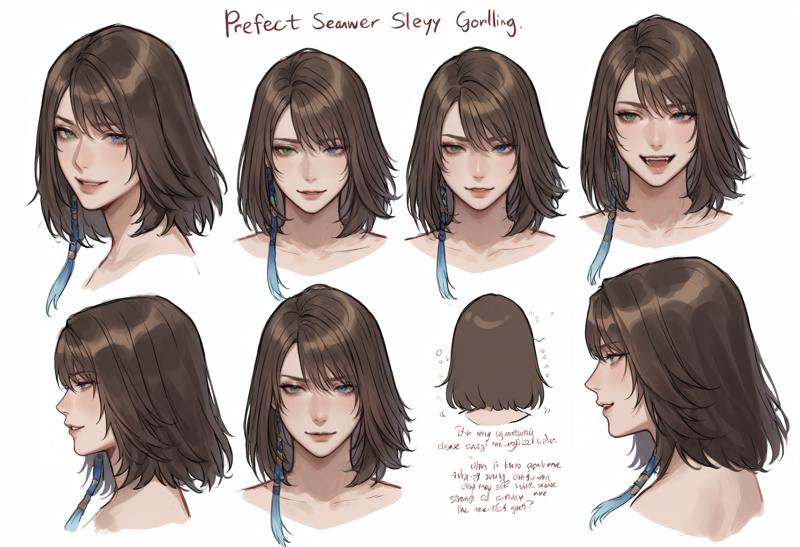 외모: 1소녀, 파란 눈, 녹색 눈, 이채색안, 갈색 머리, 단발, 중간 길이 머리, 머리장식