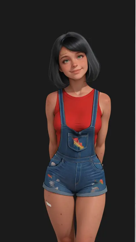 额角贴着小创可贴,牛仔背带裤,胸前口袋,口袋上有格子补丁,红色无袖上衣,露腹,背带短裤,破边短裤,短款背带短裤,卷边裤脚
