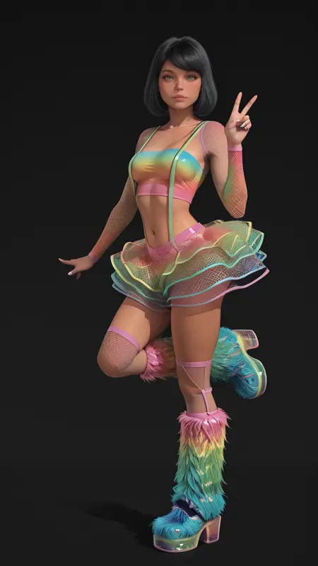 多彩服装,渐变服装,霓虹服装,彩色吊带背心,网眼背心下吊带,网眼衬衫,长袖,霓虹镶边,短款,露腹,霓虹背带,网眼裙,霓虹裙,喇叭裙,超短裙,网眼长筒袜,多彩皮毛靴,霓虹皮毛靴