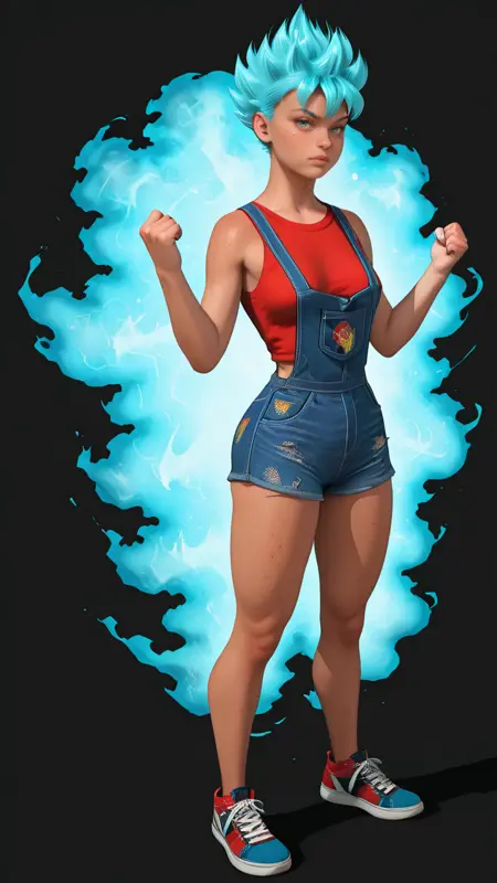 hannah_saiyan,松石绿眼睛,水蓝色头发,刺状头发,刺状刘海,水蓝色眉毛,水蓝色睫毛,嘴唇,雀斑,身体雀斑,中等大小胸部,白色指甲油,牛仔背带裤,胸前口袋,口袋上有格子补丁,红色无袖上衣,露腹,背带短裤,破边短裤,短款背带短裤,卷边裤脚,双色运动鞋,红蓝配色运动鞋,白色鞋带,水蓝色气场