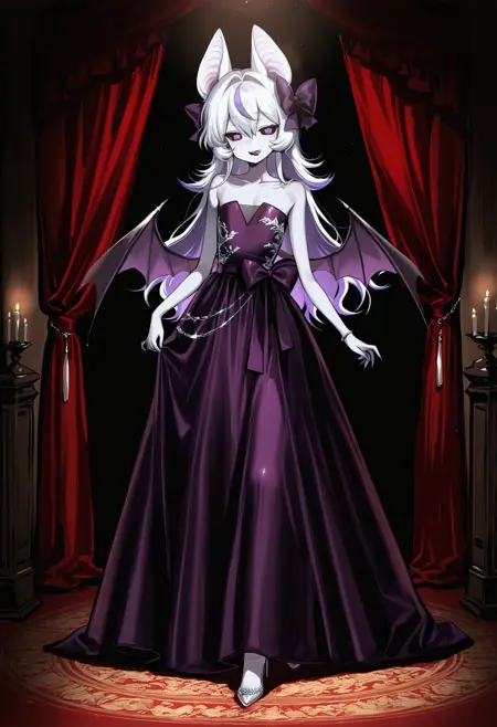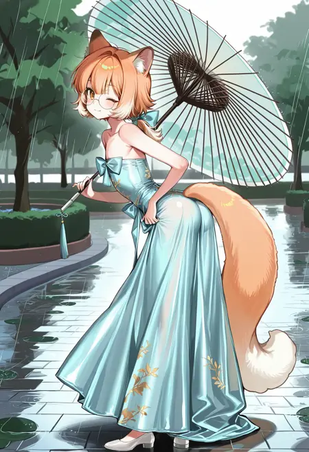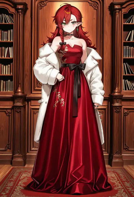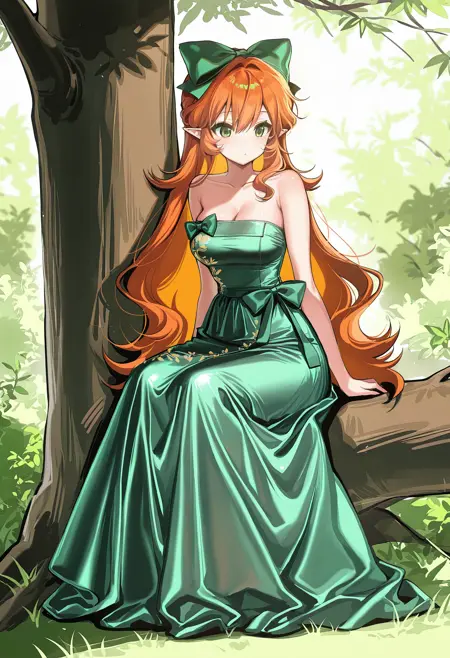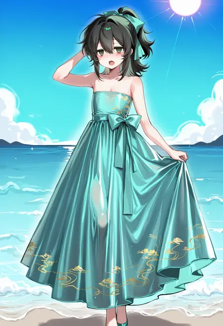 触发词:长裙、露肩、锁骨、无领裙、无吊带裙、绸缎裙、闪亮裙、印花裙、中式印花、胸前蝴蝶结、大蝴蝶结,