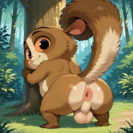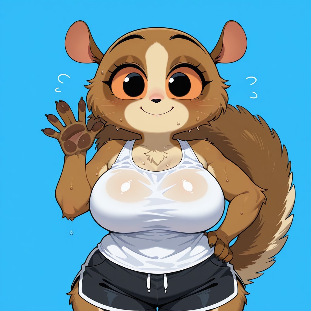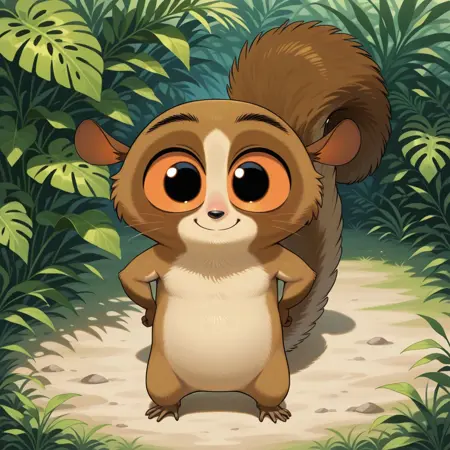 primate, mouse lemur, brown fur, two-tone fur, black pupils, orange sclera, black nose, pink snout, long fluffy tail, prehensile feet, shortstack,