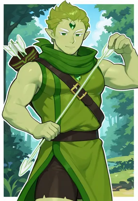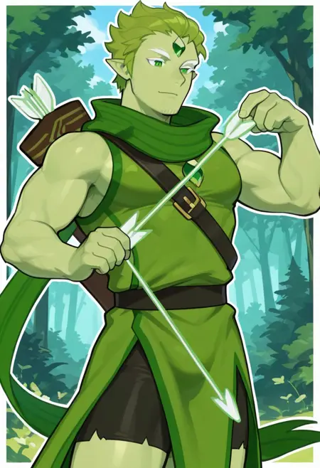 Wind Archer Cookie, man, sleeveless cloth shirt, green skin, slicked-back green hair, bow and arrows, quiver, long green scarf, green shorts, green gem embedded in his forehead