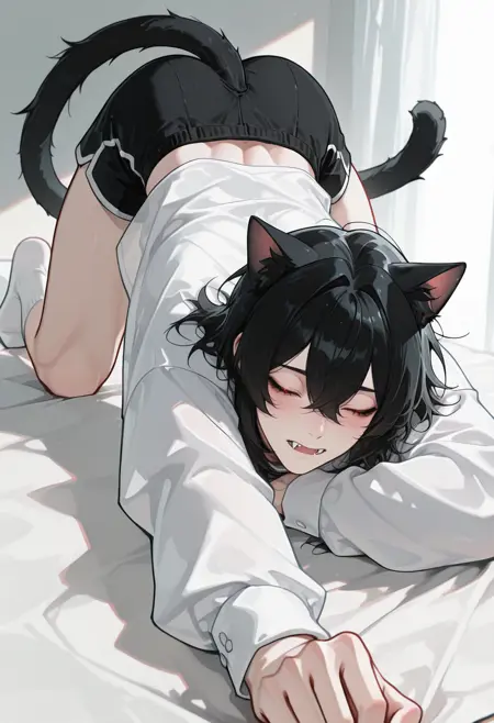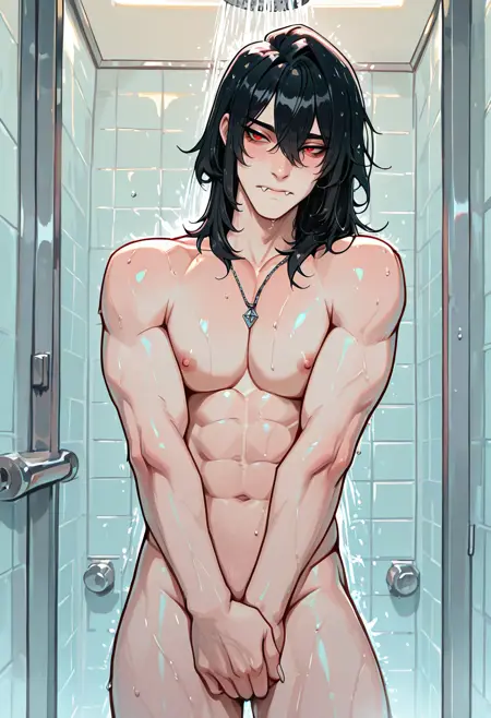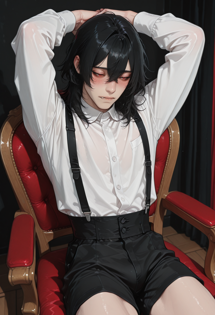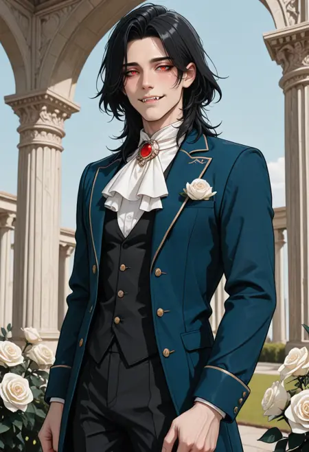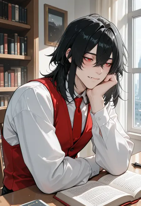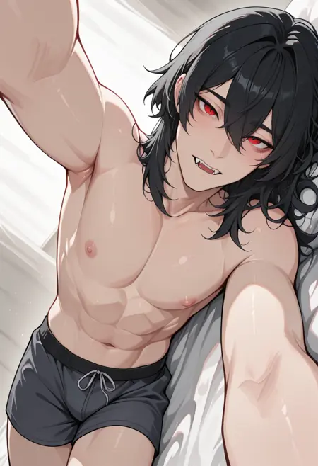 OCShVmp, 1boy, male focus, medium hair, black hair, red eyes, fangs, bishounen