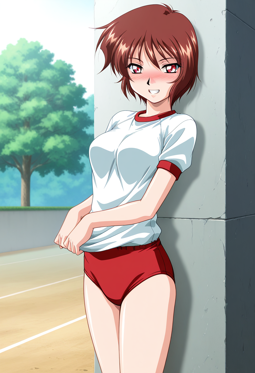 - chihayaww, red eyes, brown hair, short hair, medium breasts,