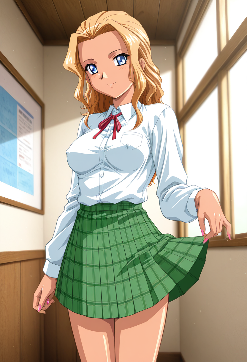 학교 유니폼, 빨간 넥리본, 젖꼭지 가린, 흰색 칼라 셔츠, 긴 소매, 녹색 플리츠 스커트, 체크 스커트, 미니 스커트,