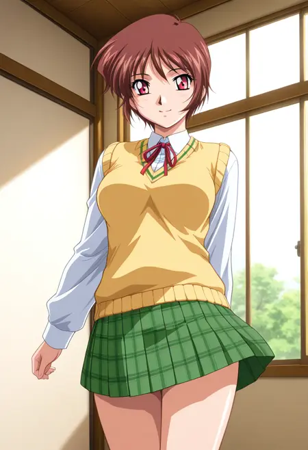 학교 유니폼, 빨간 넥리본, 노란 스웨터 조끼, 흰색 칼라 셔츠, 긴 소매, 녹색 플리츠 스커트, 체크 스커트, 미니 스커트,