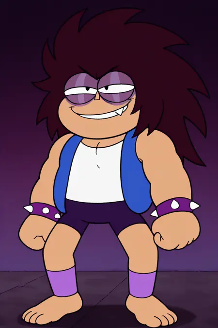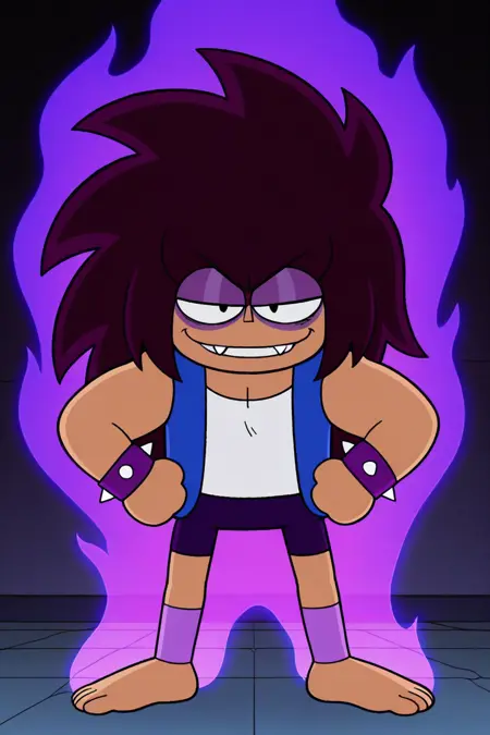 표준: TKO 일러스트, 1소년, 단독, 긴 돌기 있는 갈색 머리, 햇빛에 탄 피부, 검은 눈, 진한 보라색 아이섀도우, 진한 보라색 눈꺼풀, 두 개의 송곳니, 흰 티셔츠, 파란색 소매 없는 재킷, 보라색 돌기 있는 팔찌, 진한 파란색 반바지, 보라색 다리 보호대, 맨발