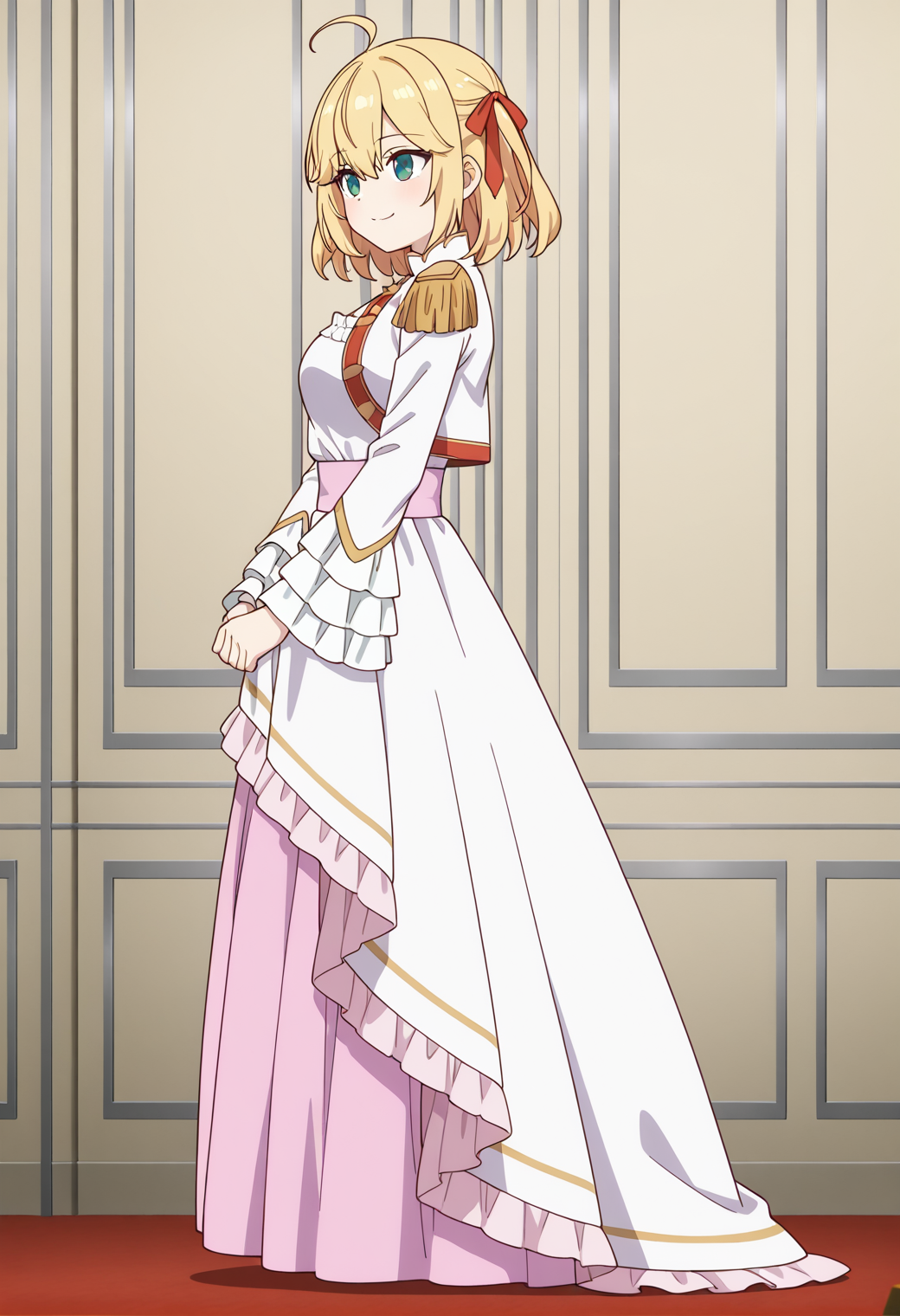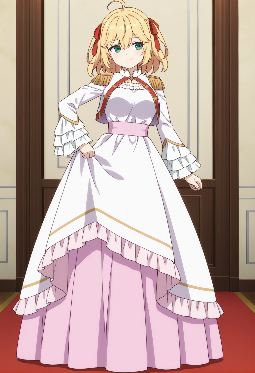 red hair ribbon, cropped jacket, epaulettes, white long sleeves, frilled sleeves, frilled dress, long dress, pink sash, pink skirt, long skirt