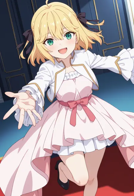 anisphia_wynn_palettia, anisphia_dress, blonde hair, medium hair, ahoge, two side up, hair between eyes, green eyes,