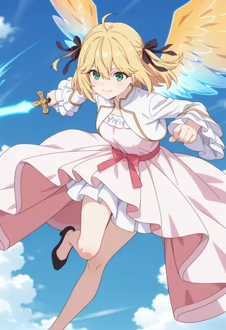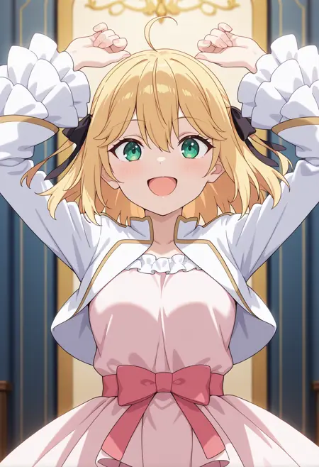anisphia_wynn_palettia, anisphia_def2, blonde hair, medium hair, ahoge, two side up, hair between eyes, green eyes,