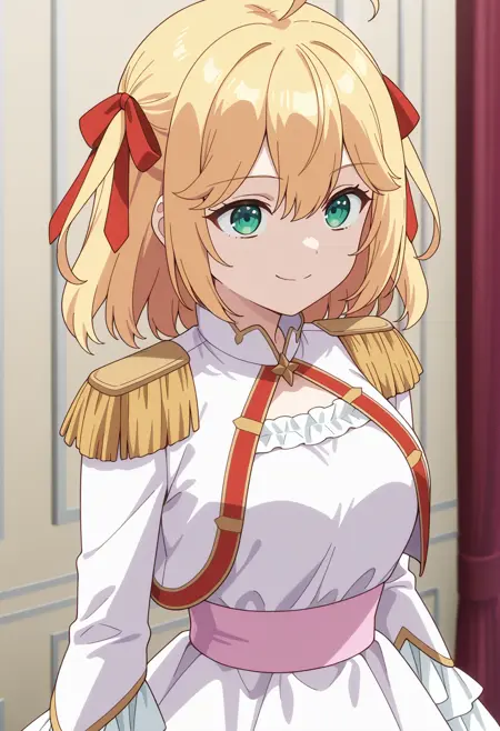 anisphia_wynn_palettia, anisphia_waltz, blonde hair, medium hair, ahoge, two side up, hair between eyes, green eyes,
