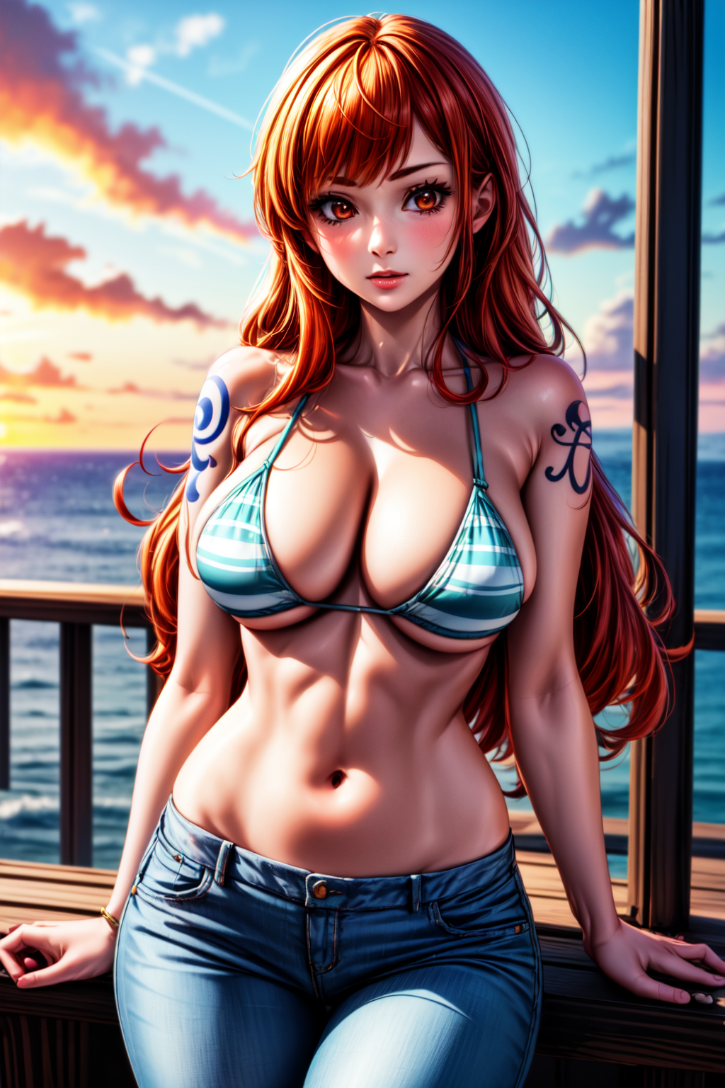 NamiOP_NDV, 1girl, orange hair, large breasts, long hair, orange eyes, bikini bra, jeans, tattoo