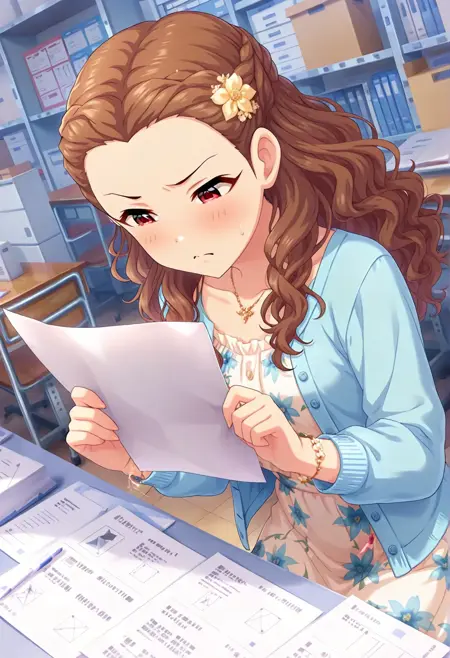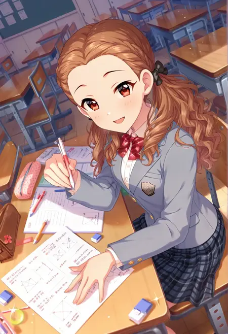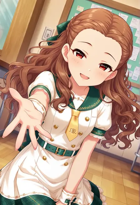 idolhiromi, 갈색 머리, 긴 머리, 곱슬머리, 물결머리, 갈색 눈, 빨간 눈, 학교 유니폼, 체크 스커트, 재킷, 블레이저, 긴 소매, 빨간 리본, 주름 스커트, 낮은 트윈테일