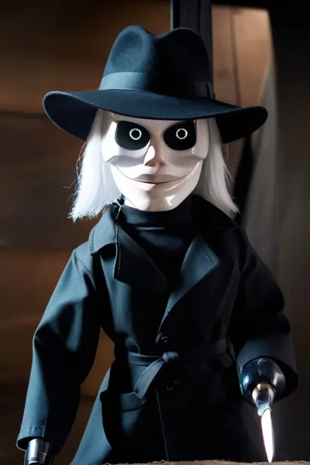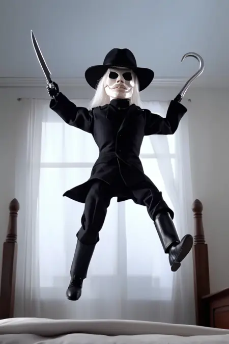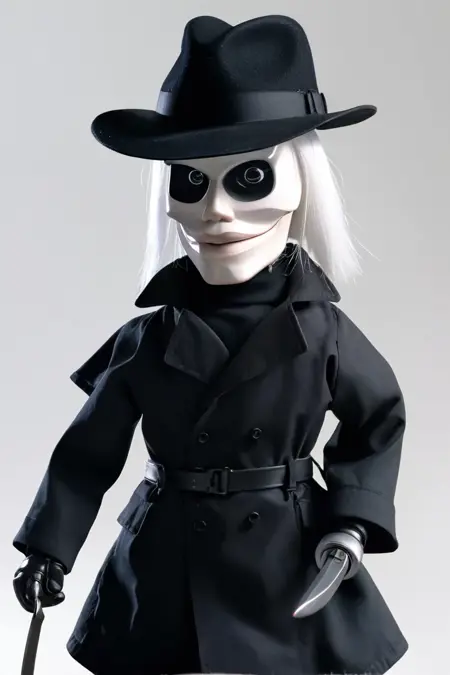 刀锋:pmblde 木偶,白发,穿着bldoutift,戴黑色帽子,无双手,装有假体刀臂和假体钩臂