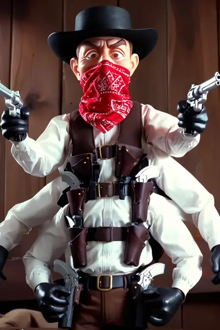 六发左轮:pmxshtr 木偶,额外手臂,共六臂,系红色头巾,穿着xshtr牛仔装,戴黑色手套和黑色牛仔帽,手持左轮手枪及枪套