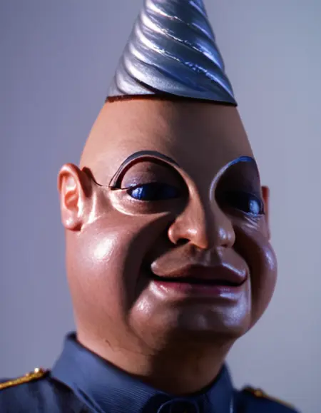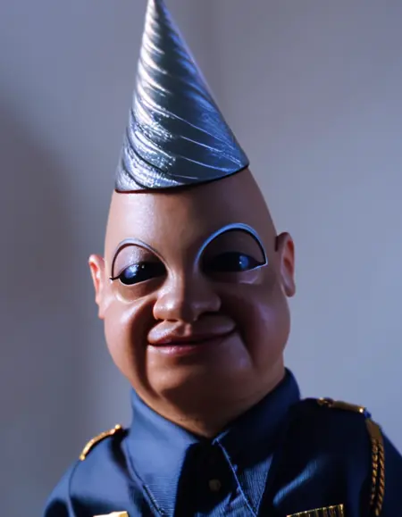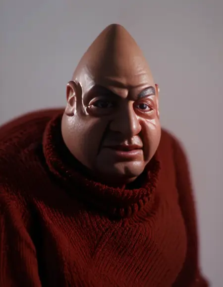 ピンヘッド:pmpinhd puppet、小さい頭、赤いリブ編みのセーター、指なし黒手袋、巨大な手
