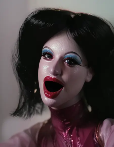 リーチウーマン:pmlehwm_puppet、開いた口、ヒルを吐き出す、長い黒髪、分け目のある前髪、化粧、リップスティック