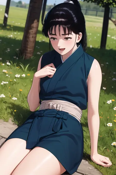 기본적인 의상 및 헤어스타일 프롬프트는 purple japanese clothes, blue eyes, sleeveless, high ponytail입니다.