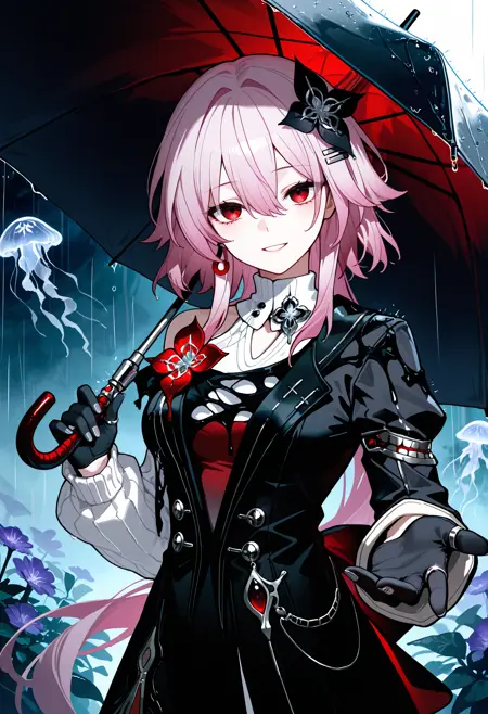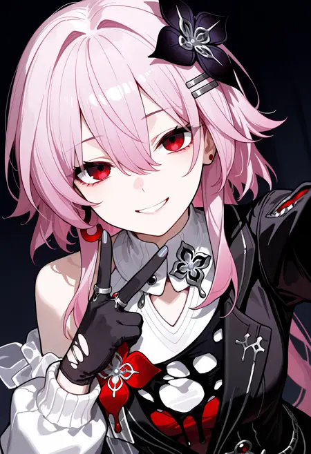 Default outfit: asymmetrical clothes, mismatched sleeves, single-shoulder_sweater, puffy sleeve, shoulder cutout, layered clothing, sweater under jacket, black jacket, lapels, silver trim, decorative zipper, red accents, black slime_(substance), dripping, liquid motif, flower brooch, jewelry, black torn gloves, silver rings, grey nails, thigh strap, ankle boots, cuffed boots, red soles, footwear flower, single earring, hair ornament, hairclip