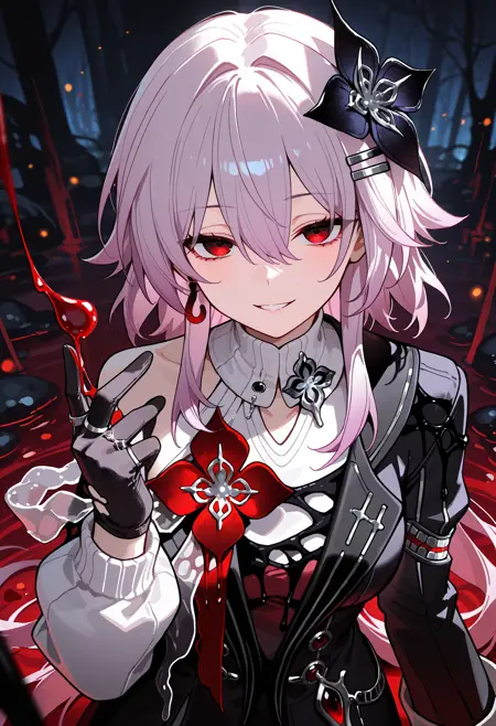 기본 복장: 비대칭 옷, 어울리지 않는 소매, 한쪽 어깨만 덮는 스웨터, 퍼프 소매, 어깨 절개, 층층이 입은 옷, 재킷 밑의 스웨터, 검정 재킷, 라펠, 은색 장식, 장식용 지퍼, 빨간 액센트, 검은 슬라임(물질), 떨어지는, 액체 무늬, 꽃 브로치, 보석, 찢어진 검정 장갑, 은반지, 회색 손톱, 허벅지 스트랩, 발목 부츠, 단추가 단 부츠, 빨간 밑창, 신발 꽃, 한쪽 귀걸이, 머리 장식, 머리클립