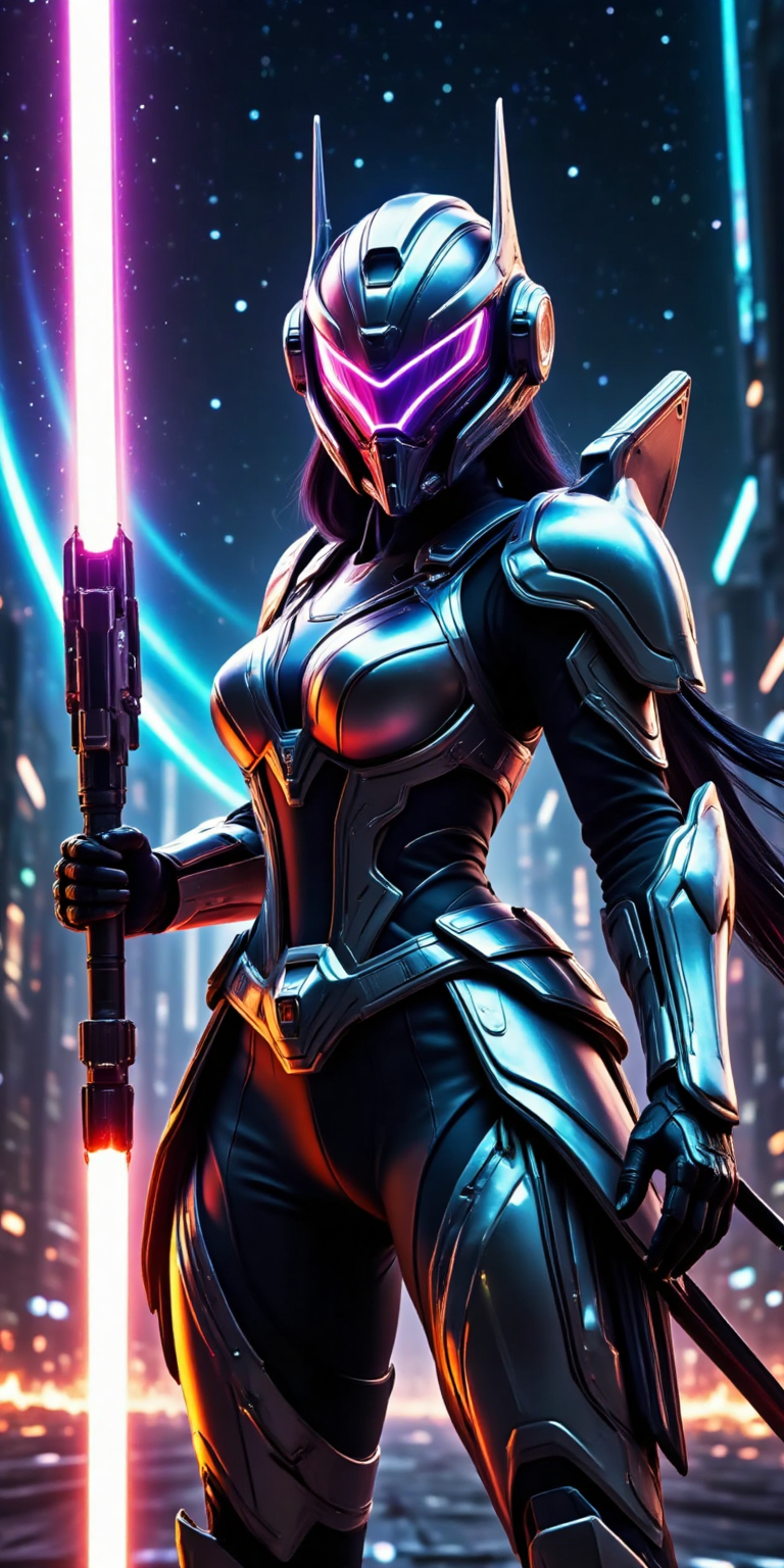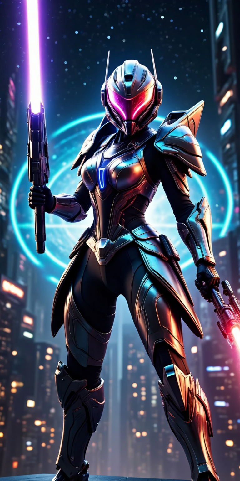 예시: solo, sfw, 헬멧, 무기, 갑옷, 1명의 소녀, 무기 들고, 과학 소설, 유방, 발광