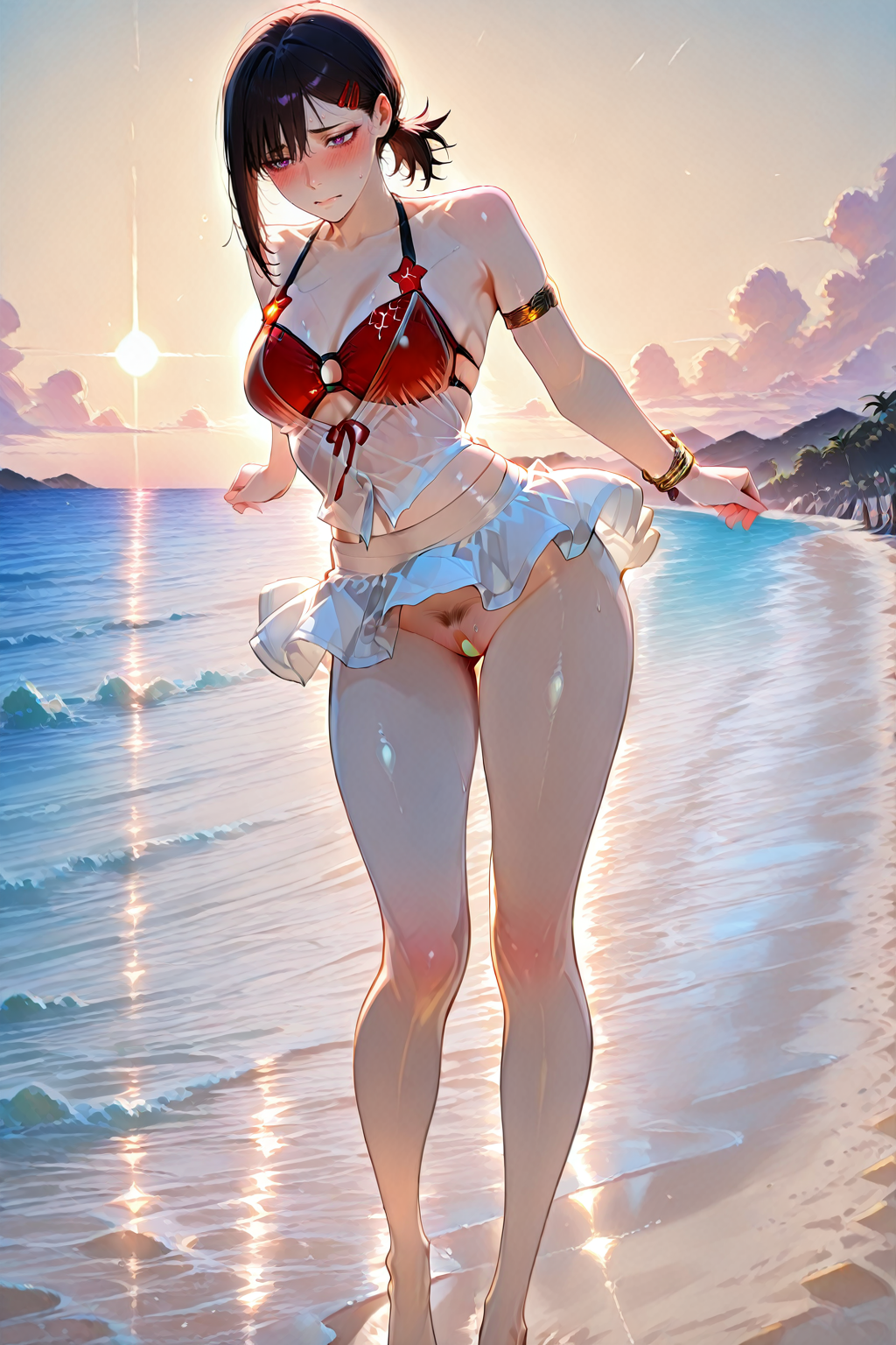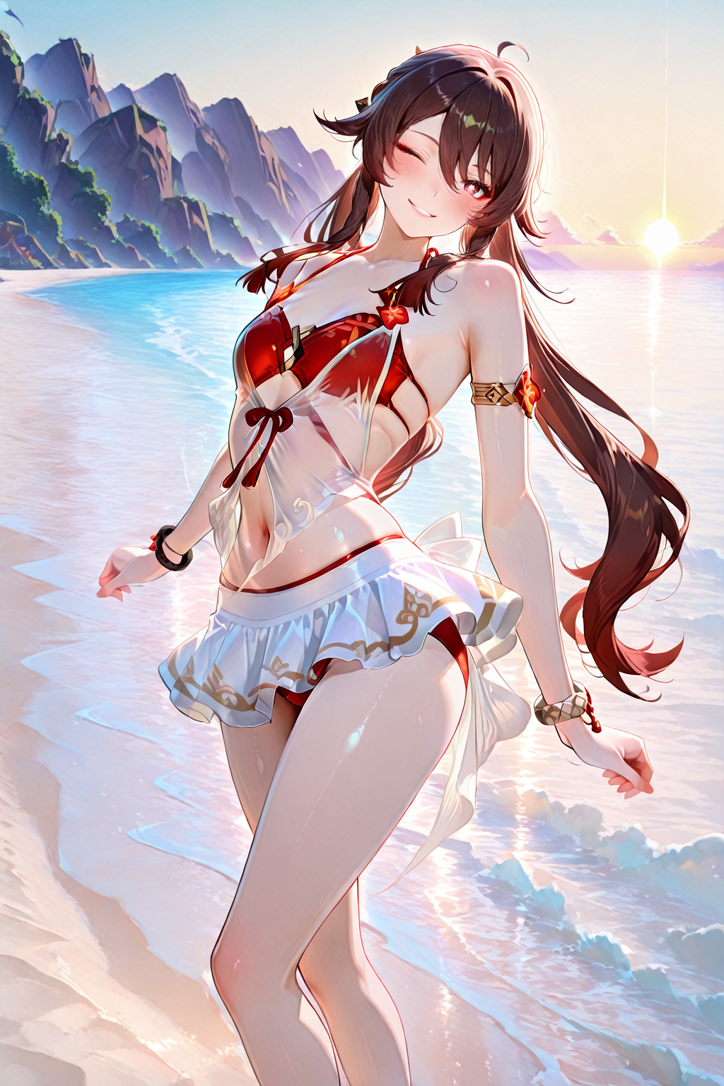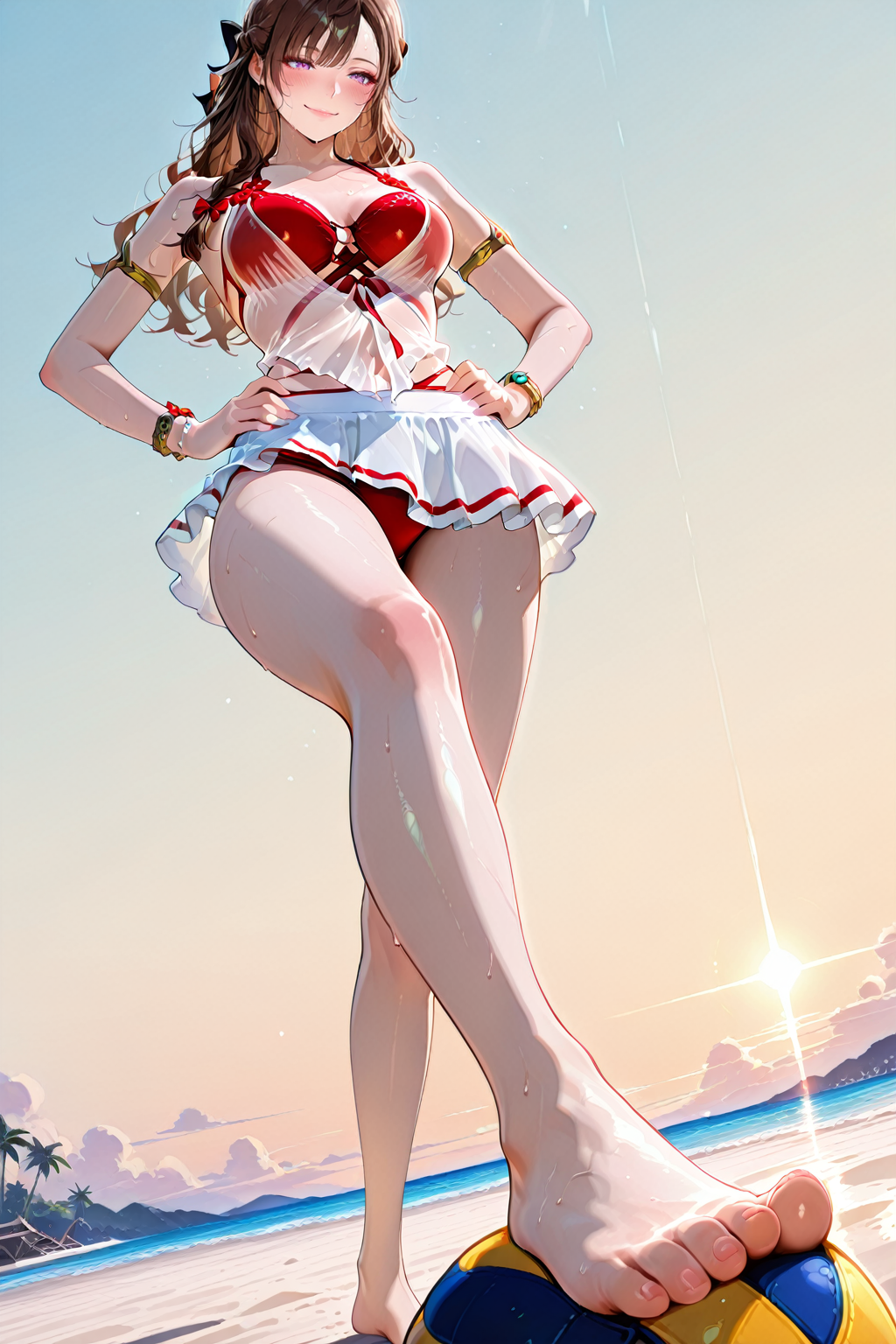 - yulinglong,swimsuit,bikini,see-through,red bikini,armlet,bracelet,ribbon,white skirt,anklet,miniskirt,sarong,