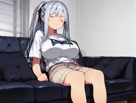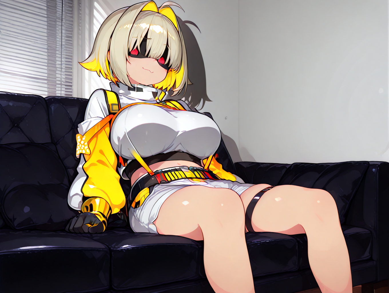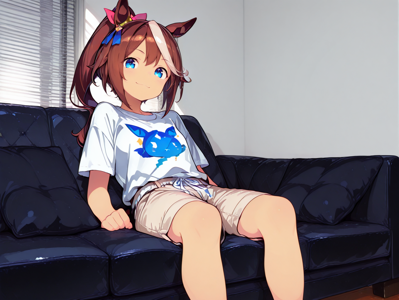 810, tshirt,shorts,closed mouth, couch, drop shadow, looking at viewer, sit,white wall, window_blinds,