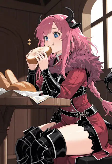 CarinaFE, 분홍색 머리, 파란 눈, 꼬리모양 머리, 뿔, 땋은 머리, 긴 머리, 검은 동물 꼬리, 허벅지 길이 부츠, 빨간 옷, 분홍색 털 장식, 검은 부츠, 검은 옷