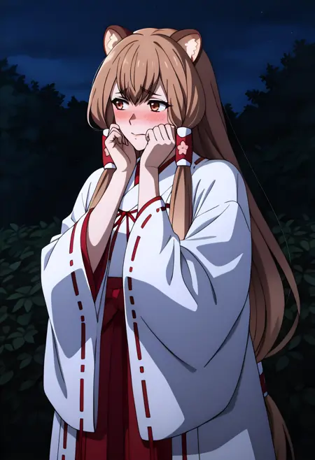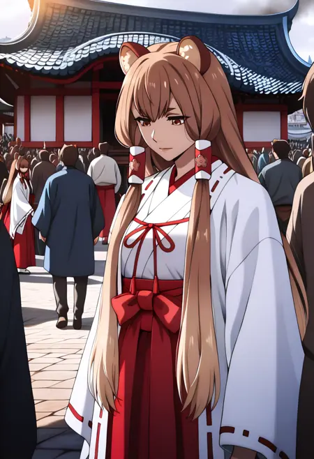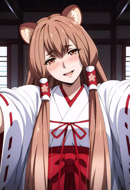 japanese clothes, miko, white chihaya (clothing), white kimono, white kosode, wide sleeves, ribbon-trimmed sleeves, red bow, red hakama, hakama skirt, raccoon tail, zouri, white socks