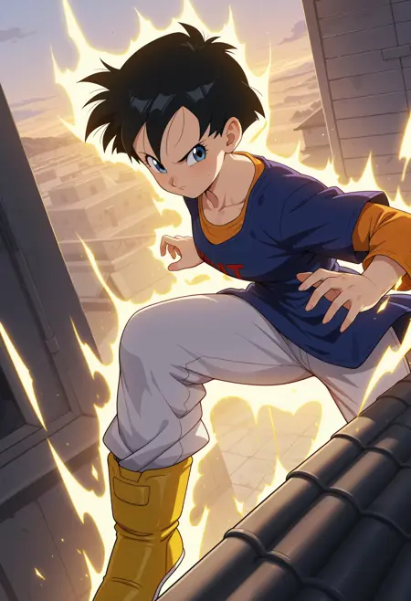 1girl, videl, 蓝眼睛, 黑发, 蓝色短袖上衣, 橙色长袖内衣, 衣服上有红色文字 "FIGHT", 白色长裤, 黄色靴子, 圆领, 睫毛, 低角度英雄降落于天下第一武道会,地面瓷砖碎裂,尘土飞溅,动态动漫平涂阴影,锐利的线条,速度线,运动模糊,美观,杰作,艺术作品,最高质量,最佳,细节丰富,细节丰富,单人,