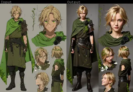 애니메이션/만화 → 사실적 이미지: 2D 스타일리시 아트워크를 사진처럼 사실적인 이미지로 변환하면서 캐릭터 포즈, 표정, 장면 구성은 그대로 유지