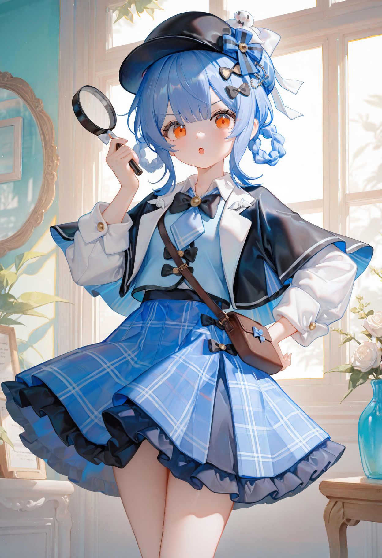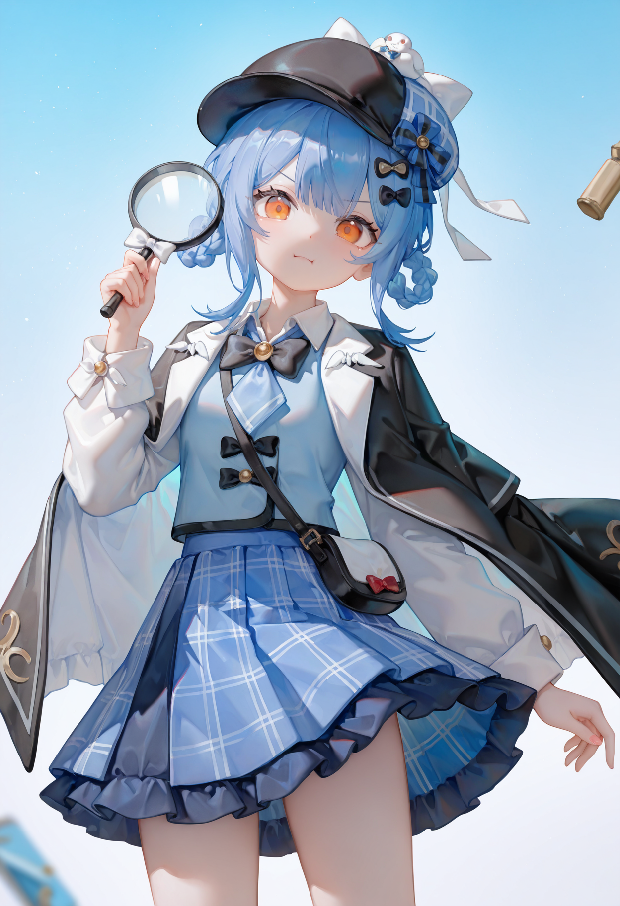 tachibana sherry,1girl,solo,blue hair,skirt,hat,magnifying glass,bow,blue skirt,braid,orange eyes,plaid,