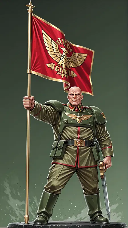 SergeantKell40k, 1boy, bald, military uniform, holding flag,