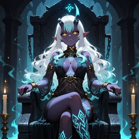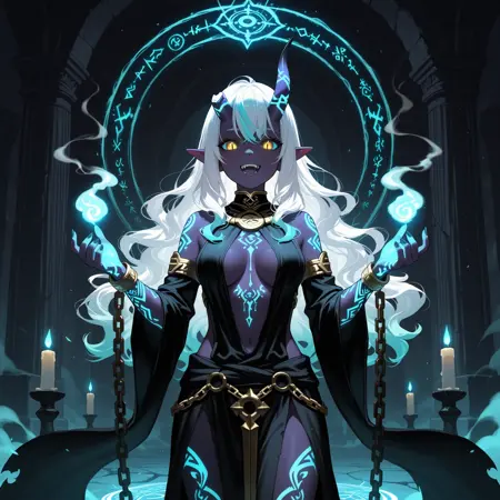 1girl, oni girl, demon girl, dark purple skin, glowing skin, long wavy hair, white hair with turquoise tips, golden eyes, slit pupils, glowing eyes, sharp teeth, fangs, elf ears, asymmetrical horns, broken horn, horn with chain accessory, glowing runes tattoos faintly visible in the shadows